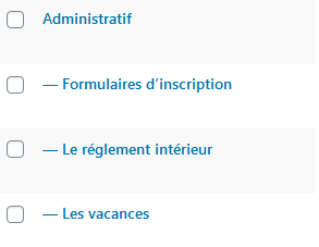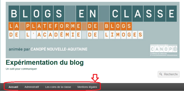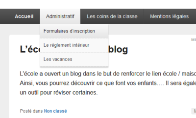 Par exemple sur la page d'accueil de Blogs en classe où (avec le thème Catch Box ) les pages apparaissent au lecteur dans un bandeau noir « Accueil », « Créez votre blog ? », « Assistance & tutoriels»... « Mentions Légales ».